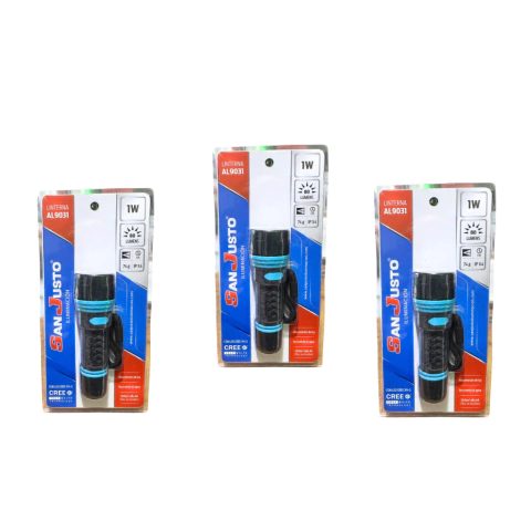 Linterna compacta San Justo AL9031, ideal para uso diario, camping o emergencias. Con tecnología LED CREE XH-G, ofrece una potente iluminación de 80 lúmenes, con un alcance óptimo en espacios reducidos.